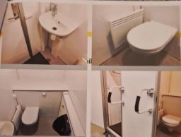- Auf beiden Seiten Waschbecken mit Warm- und Kaltwasser, Spiegel und Heizung